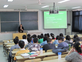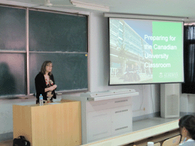 交流结束后,Lesley Cormack院长针对我项目的学生专门做了题为“进入加拿大大学课堂的准备”的讲座,向学生详细讲解了加拿大大学课堂特点和学习注意事项,并就部分学生所关心的问题进行了细致、深入的解答,同学们受益匪浅,受到了同学们的热烈欢迎。