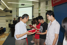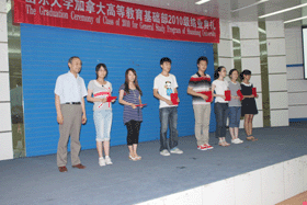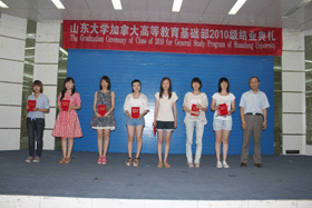 山东大学本科生院副院长、本科生招生办公室主任柳丽华宣读了2010级优秀学生名单,国际合作与交流处处长、该项目管委会副主任佟光武向优秀学生颁发荣誉证书并合影留念。计算机与软件学院党委书记、该项目主任汤晋立主持典礼。学生代表刘政轩在发言中感谢老师的栽培,表示一定不负众望,将把山东大学良好的学风带到大洋彼岸,力争早日成才,回来报效祖国。